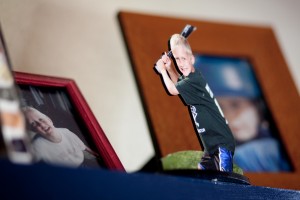Photos of Treyton, 6, line a shelf in his bedroom, where it is easy to see what a devoted baseball fan he was. Photo by Lukas Keapproth